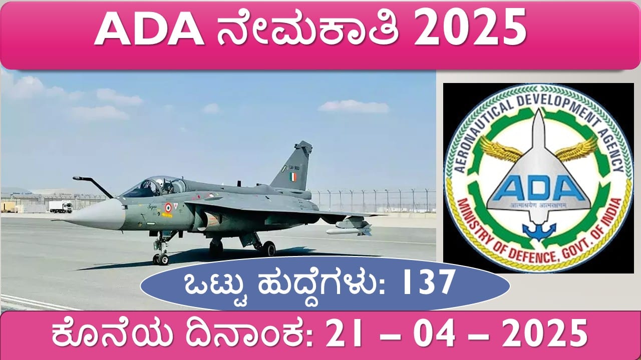 ADA ನೇಮಕಾತಿ 2025: ವಿಮಾನೋದ್ಯಮ ಅಭಿವೃದ್ಧಿ ಸಂಸ್ಥೆ (Aeronautical Development Agency – ADA) 137 ಪ್ರಾಜೆಕ್ಟ್ ಸೈನ್ಟಿಸ್ಟ್ ಹುದ್ದೆಗಳ ನೇಮಕಾತಿಗೆ ಅರ್ಜಿಗಳನ್ನು ಆಹ್ವಾನಿಸಿದೆ. ಬೆಂಗಳೂರು –