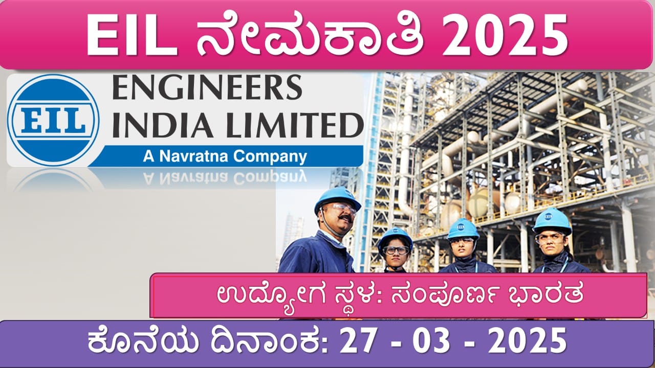 📢 ನೇಮಕಾತಿ ಮಾಹಿತಿ:ಎಂಜಿನಿಯರ್ಸ್ ಇಂಡಿಯಾ ಲಿಮಿಟೆಡ್ (EIL) 10 ಮ್ಯಾನೇಜರ್ ಮತ್ತು ಆಫೀಸರ್ ಹುದ್ದೆಗಳಿಗೆ ಅರ್ಜಿಗಳನ್ನು ಆಹ್ವಾನಿಸಿದೆ. ಆಸಕ್ತ ಅಭ್ಯರ್ಥಿಗಳು 27 ಮಾರ್ಚ್ 2025ರೊಳಗೆ ಆನ್ಲೈನ್ ಮೂಲಕ