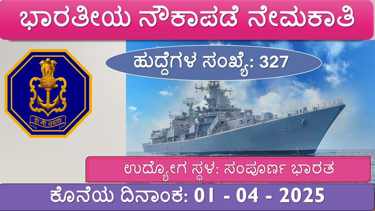 ಭಾರತೀಯ ನೌಕಾಪಡೆಯ ನೇಮಕಾತಿ 2025: 327 ಗ್ರೂಪ್ C ಹುದ್ದೆಗಳ ನೇಮಕಾತಿಗೆ ಭಾರತೀಯ ನೌಕಾಪಡೆ ಅರ್ಜಿಗಳನ್ನು ಆಹ್ವಾನಿಸಿದೆ. ಸರ್ಕಾರಿ ಉದ್ಯೋಗದ ಆಸಕ್ತರು ಈ ಅವಕಾಶವನ್ನು ಸದುಪಯೋಗಪಡಿಸಿಕೊಳ್ಳಬಹುದು. ಆಸಕ್ತ