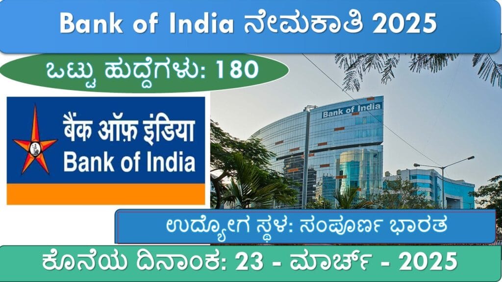 ಬ್ಯಾಂಕ್ ಆಫ್ ಇಂಡಿಯಾ (BOI) 180 ಅಧಿಕಾರಿಗಳ ಹುದ್ದೆಗಳ ಭರ್ತಿಗಾಗಿ ಅಧಿಸೂಚನೆ ಬಿಡುಗಡೆ ಮಾಡಿದೆ. ಆಸಕ್ತ ಮತ್ತು ಅರ್ಹ ಅಭ್ಯರ್ಥಿಗಳು 23 ಮಾರ್ಚ್ 2025ರೊಳಗೆ ಆನ್ಲೈನ್ ಮೂಲಕ ಅರ್ಜಿ ಸಲ್ಲಿಸಬಹುದು.