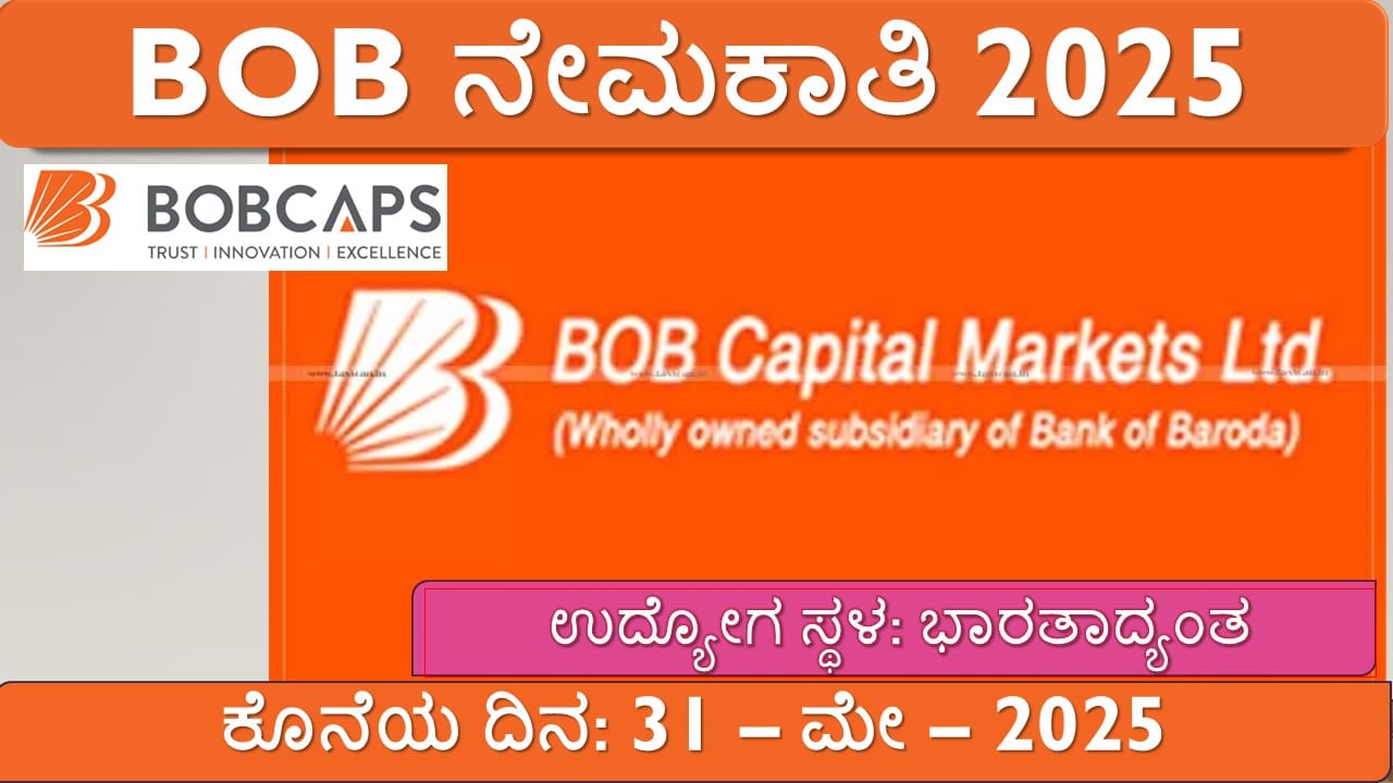 BOB Capital Markets Recruitment 2025: BOB ಕ್ಯಾಪಿಟಲ್ ಮಾರ್ಕೆಟ್ಸ್ ಸಂಸ್ಥೆ 70 ಬಿಸಿನೆಸ್ ಡೆವಲಪ್ಮೆಂಟ್ ಮ್ಯಾನೇಜರ್ ಹುದ್ದೆಗಳಿಗೆ ಅರ್ಹ ಅಭ್ಯರ್ಥಿಗಳಿಂದ ಅರ್ಜಿಗಳನ್ನು ಆಹ್ವಾನಿಸಿದೆ. ಭಾರತಾದ್ಯಂತ ಸರ್ಕಾರಿ