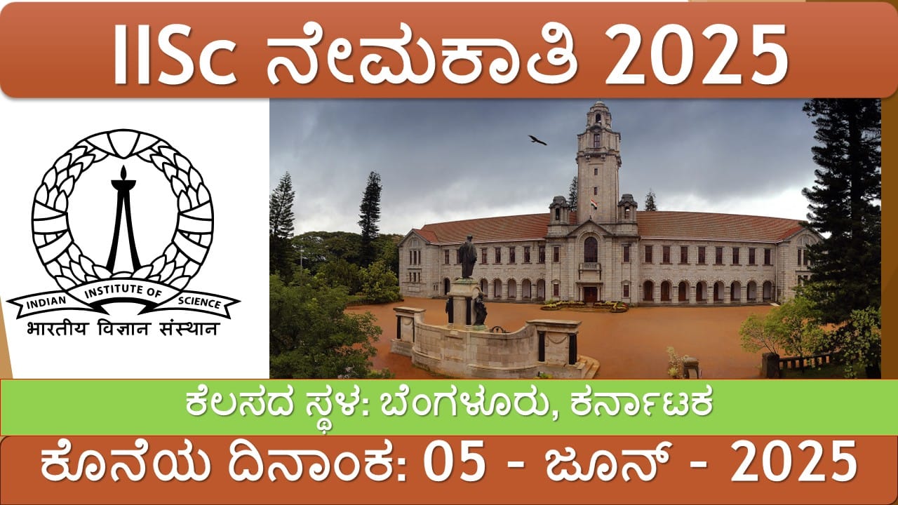 📢 ವಿವರಣೆ: ಭಾರತೀಯ ವಿಜ್ಞಾನ ಸಂಸ್ಥೆ (IISc) 2025ರ ನೇಮಕಾತಿಯಡಿಯಲ್ಲಿ Senior Editorial Assistant ಹುದ್ದೆಗಳಿಗೆ ಅರ್ಹ ಅಭ್ಯರ್ಥಿಗಳಿಂದ ಅರ್ಜಿ ಆಹ್ವಾನಿಸಿದೆ. ಈ ಹುದ್ದೆಗಳು ಬೆಂಗಳೂರಿನಲ್ಲಿ ಇರುತ್ತವೆ