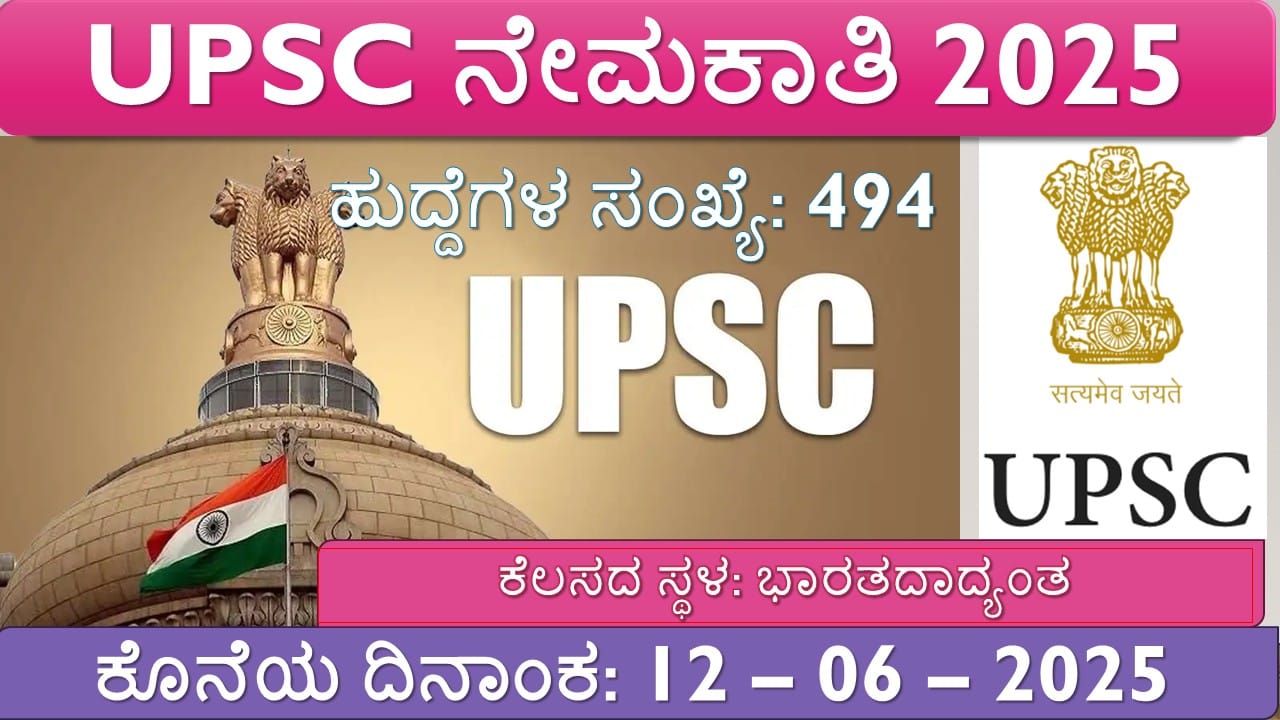 ಯೂನಿಯನ್ ಪಬ್ಲಿಕ್ ಸರ್ವಿಸ್ ಕಮಿಷನ್ (UPSC) 494 ವಿವಿಧ ಅಧಿಕಾರಿ ಮತ್ತು ಸ್ಪೆಷಲಿಸ್ಟ್ ಹುದ್ದೆಗಳಿಗೆ ಅಧಿಕೃತ ನೇಮಕಾತಿ ಅಧಿಸೂಚನೆಯನ್ನು ಮೇ 2025ರಲ್ಲಿ ಪ್ರಕಟಿಸಿದೆ. ಆಸಕ್ತರು ಮತ್ತು ಅರ್ಹ