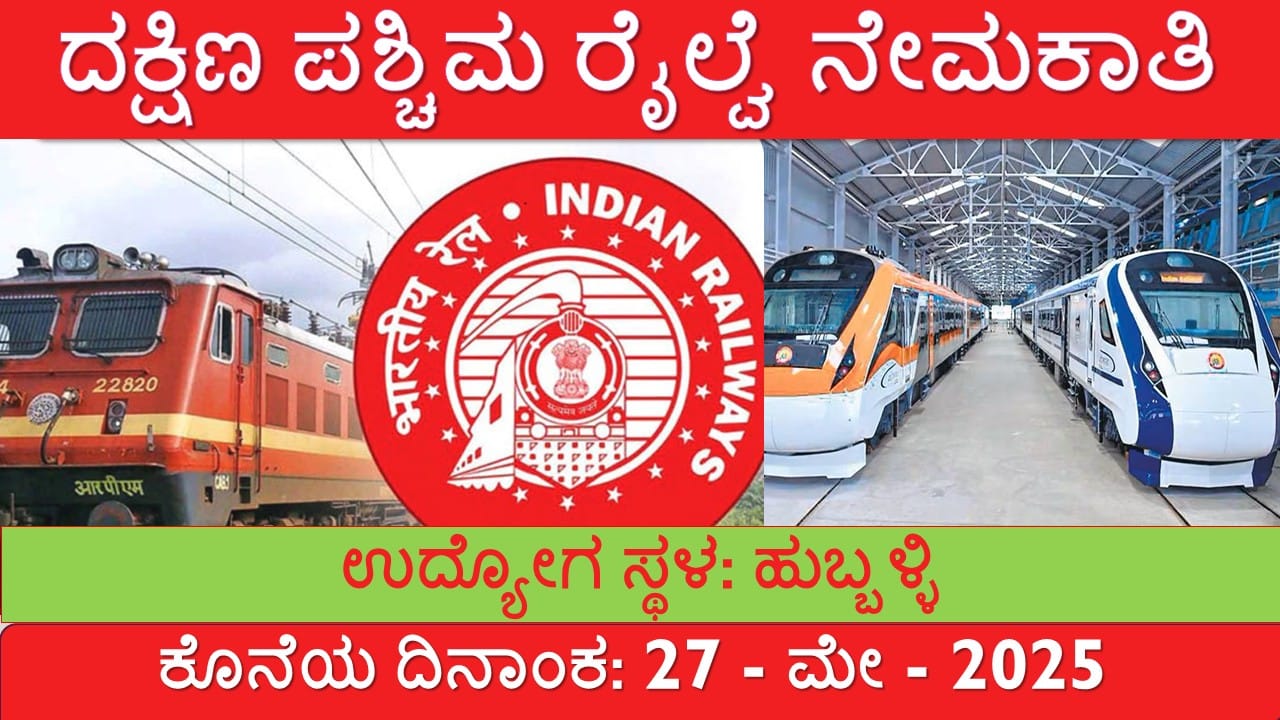 ದಕ್ಷಿಣ ಪಶ್ಚಿಮ ರೈಲ್ವೆ (South Western Railway) 2025ರ ನೇಮಕಾತಿ ಅಧಿಸೂಚನೆ ಪ್ರಕಟವಾಗಿದೆ. ಹುಬ್ಬಳ್ಳಿ – ಕರ್ನಾಟಕದಲ್ಲಿ ಕೆಲಸ ಹುಡುಕುತ್ತಿರುವ ಅಭ್ಯರ್ಥಿಗಳಿಗೆ ಇದು ಉತ್ತಮ ಅವಕಾಶ. ಆಸಕ್ತರು