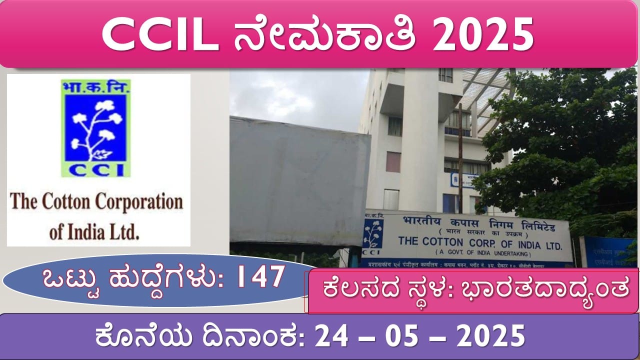 ಸಂಸ್ಥೆ ಹೆಸರು: ಕಾಟನ್ ಕಾರ್ಪೊರೇಶನ್ ಆಫ್ ಇಂಡಿಯಾ ಲಿಮಿಟೆಡ್ (Cotton Corporation of India Limited) ಒಟ್ಟು ಹುದ್ದೆಗಳು: 147 ಕೆಲಸದ ಸ್ಥಳ: ಭಾರತದೆಲ್ಲೆಡೆ ಹುದ್ದೆಗಳ ವಿವರಗಳು