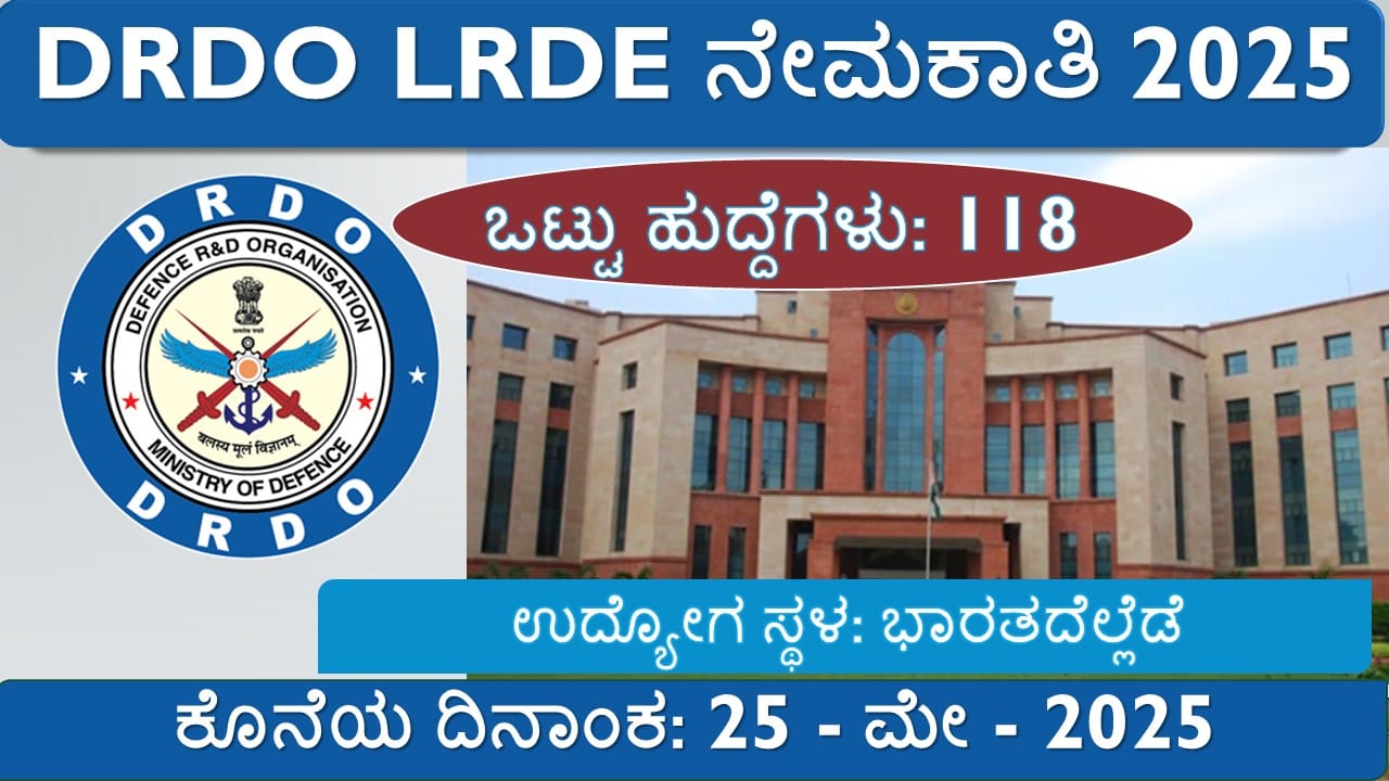 ಡಿಆರ್ಡಿಓ ಎಲೆಕ್ಟ್ರಾನಿಕ್ಸ್ ಮತ್ತು ರಾಡಾರ್ ಡೆವಲಪ್ಮೆಂಟ್ ಎಸ್ಟಾಬ್ಲಿಶ್ಮೆಂಟ್ (LRDE) ಸಂಸ್ಥೆ 2025ನೇ ಸಾಲಿನಲ್ಲಿ 118 ಅಪ್ರೆಂಟಿಸ್ ಹುದ್ದೆಗಳ ಭರ್ತಿಗೆ ಅರ್ಹ ಅಭ್ಯರ್ಥಿಗಳಿಂದ ಆನ್ಲೈನ್ ಮೂಲಕ ಅರ್ಜಿಗಳನ್ನು ಆಹ್ವಾನಿಸಿದೆ.
