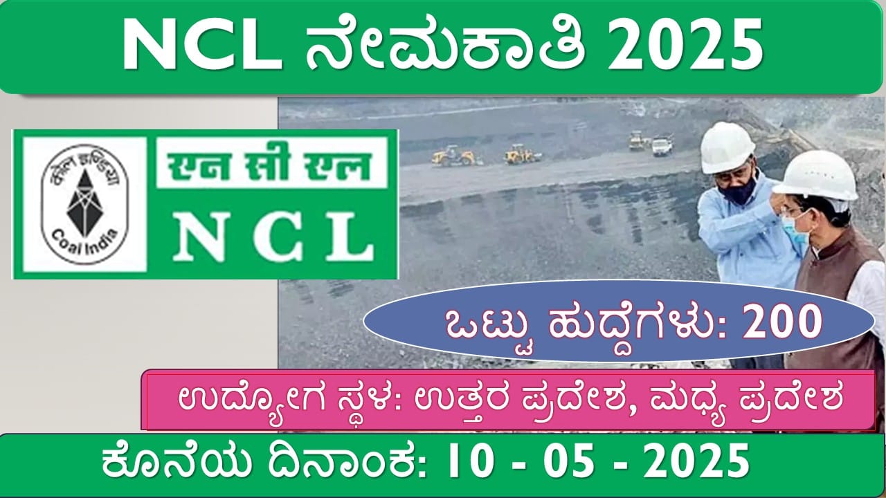 NCL ನೇಮಕಾತಿ 2025: ನಾರ್ದರ್ನ್ ಕೋಲ್ಫೀಲ್ಡ್ಸ್ ಲಿಮಿಟೆಡ್ (NCL) ನಿಂದ 200 ಟೆಕ್ನಿಷಿಯನ್ ಹುದ್ದೆಗಳಿಗೆ ಆನ್ಲೈನ್ ಅರ್ಜಿ ಆಹ್ವಾನಿಸಲಾಗಿದೆ. ಕೊನೆಯ ದಿನಾಂಕ: 10-ಮೇ-2025. NCL ನೇಮಕಾತಿ ಮುಖ್ಯ