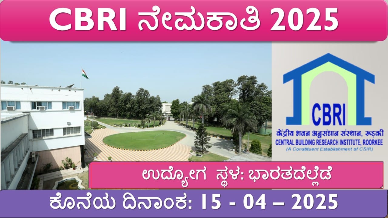 CBRI ನೇಮಕಾತಿ 2025: ಸೆಂಟ್ರಲ್ ಬಿಲ್ಡಿಂಗ್ ರಿಸರ್ಚ್ ಇನ್ಸ್ಟಿಟ್ಯೂಟ್ (CBRI) 17 ತಂತ್ರಜ್ಞ (Technician) ಹುದ್ದೆಗಳಿಗೆ ಅರ್ಜಿ ಆಹ್ವಾನಿಸಿದೆ. ಆಸಕ್ತರು ಹಾಗೂ ಅರ್ಹ ಅಭ್ಯರ್ಥಿಗಳು 15-ಎಪ್ರಿಲ್-2025 ಒಳಗಾಗಿ