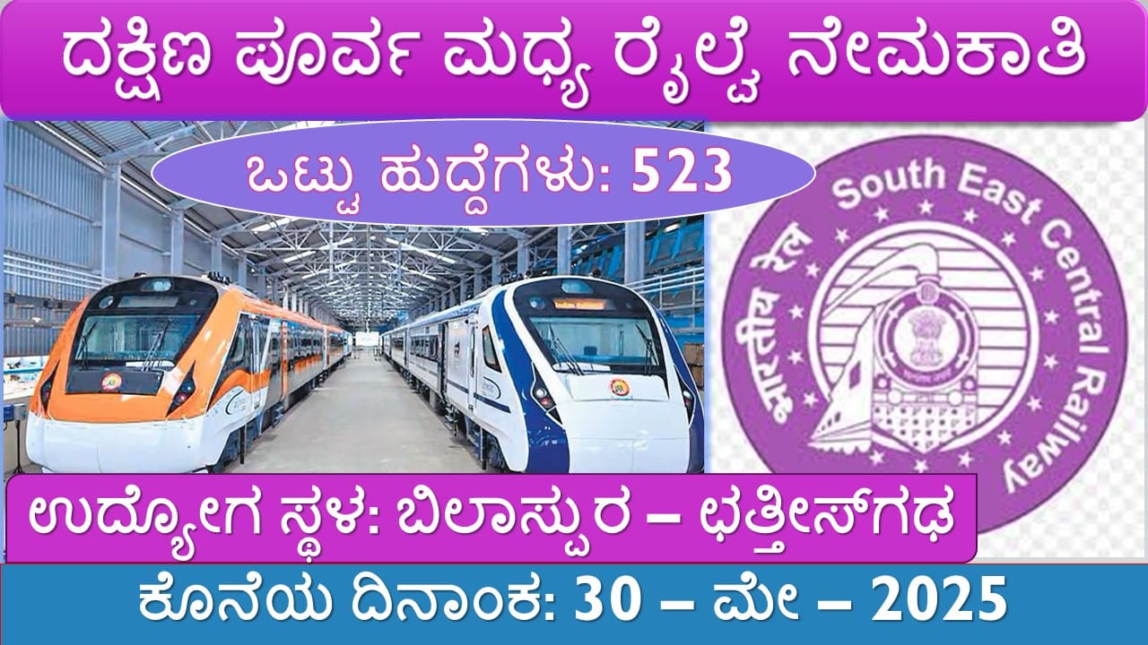 South East Central Railway ನೇಮಕಾತಿ 2025: 523 ಇಂಟರ್ನ್ ಹುದ್ದೆಗಳ ಭರ್ತಿಗಾಗಿ ಅರ್ಜಿಗಳನ್ನು ಆಹ್ವಾನಿಸಲಾಗಿದೆ. ದಕ್ಷಿಣ ಪೂರ್ವ ಮಧ್ಯ ರೈಲ್ವೆ (South East Central Railway)