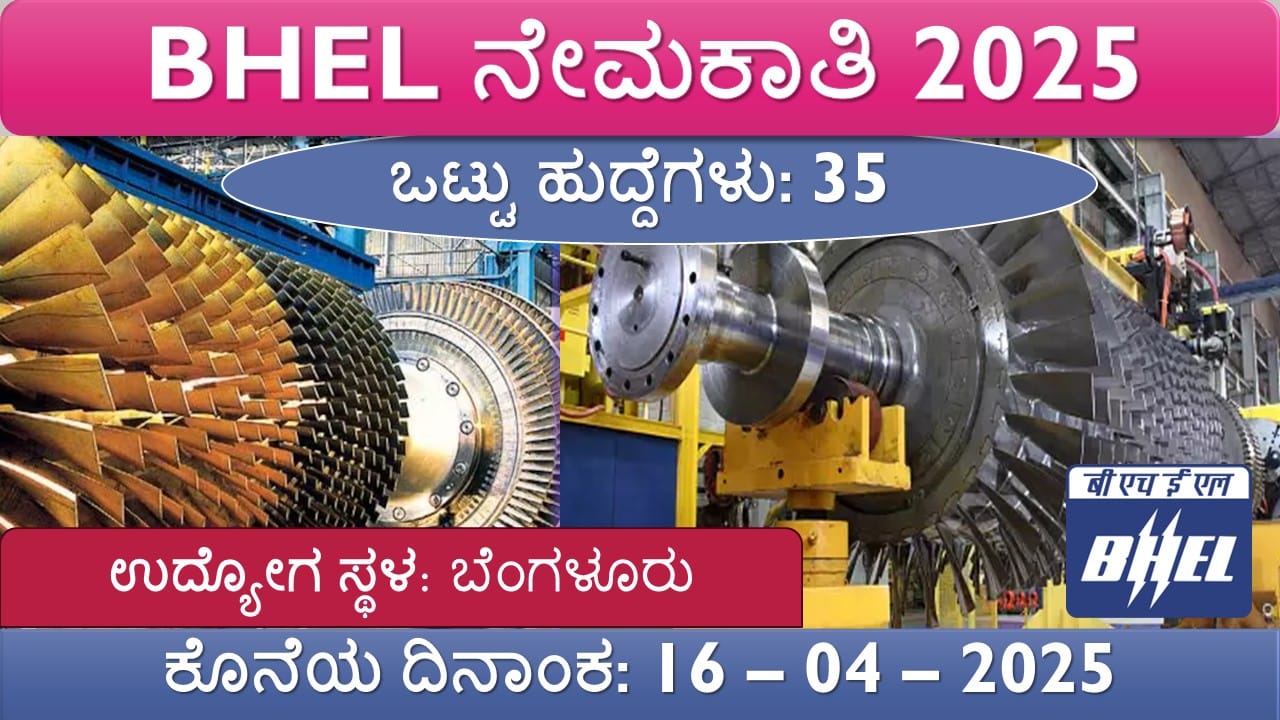 ಭಾರತ್ ಹೆವಿ ಎಲೆಕ್ಟ್ರಿಕಲ್ಸ್ ಲಿಮಿಟೆಡ್ (BHEL) ಪ್ರಾಜೆಕ್ಟ್ ಇಂಜಿನಿಯರ್, ಮೆಡಿಕಲ್ ಕನ್ಸಲ್ಟೆಂಟ್ ಹುದ್ದೆಗಳ 35 ಹುದ್ದೆಗಳ ನೇಮಕಾತಿಗೆ ಅಧಿಸೂಚನೆ ಬಿಡುಗಡೆ ಮಾಡಿದೆ. ಬೆಂಗಳೂರು – ಕರ್ನಾಟಕದಲ್ಲಿ ಉದ್ಯೋಗ