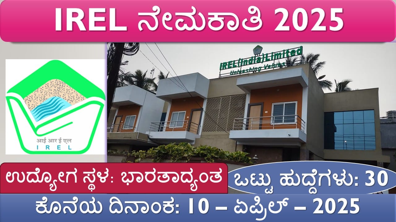 IREL ನೇಮಕಾತಿ 2025: ಇಂಡಿಯನ್ ರೇರ್ ಎರ್ಥ್ಸ್ ಲಿಮಿಟೆಡ್ (IREL) 30 ಕಾರ್ಯಕಾರಿ ಹುದ್ದೆಗಳ ಭರ್ತಿಗೆ ಅಧಿಕೃತ ಅಧಿಸೂಚನೆ ಹೊರಡಿಸಿದೆ. ಚಾವರ, ಚತ್ರಪುರ, ಮಣವಾಲಕುರಿಚಿ ಮತ್ತು ಮುಂಬೈಯಲ್ಲಿ