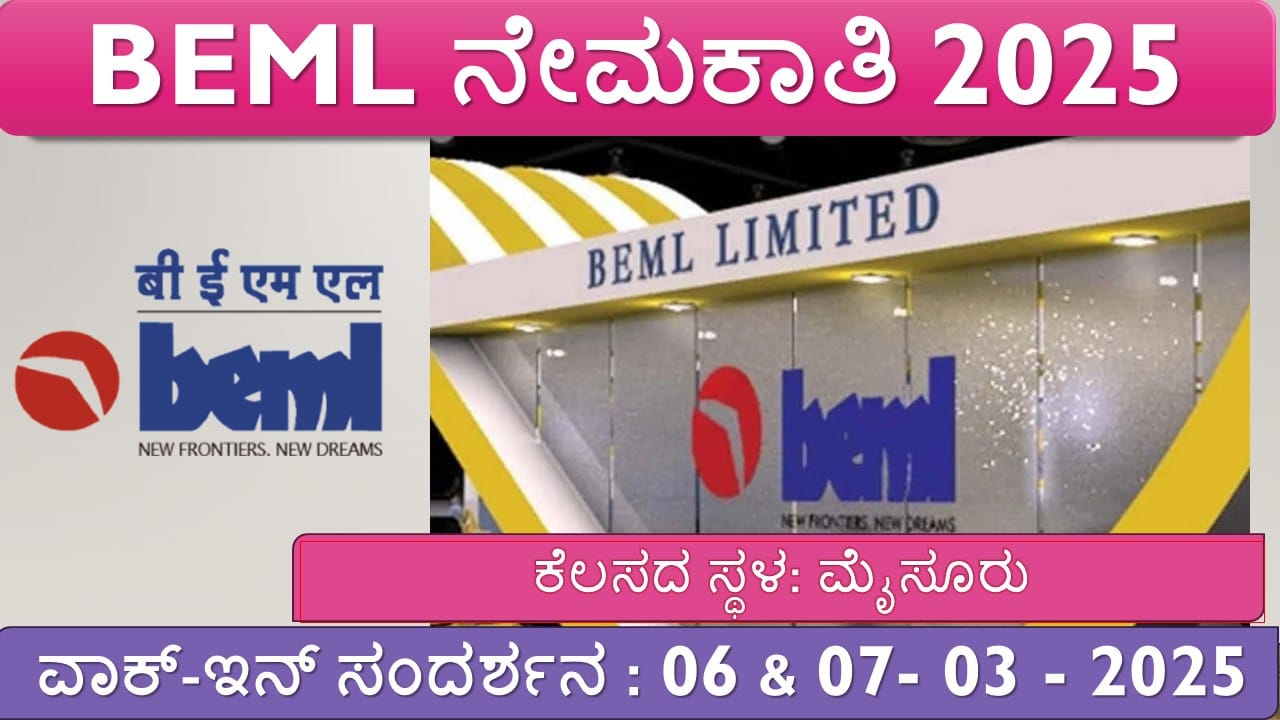 BEML ನೇಮಕಾತಿ 2025:ಭಾರತ ಎರ್ಥ್ ಮಾವರ್ಸ್ ಲಿಮಿಟೆಡ್ (BEML) 2025 ರ ಫೆಬ್ರವರಿ ತಿಂಗಳಲ್ಲಿ 11 ಸಹಾಯಕ ನಿರ್ವಾಹಕ/ನಿರ್ವಾಹಕ ಹುದ್ದೆಗಳನ್ನು ಭರ್ತಿ ಮಾಡಲು ಅರ್ಜಿಗಳನ್ನು ಆಹ್ವಾನಿಸಿದೆ. ಕರ್ನಾಟಕದ