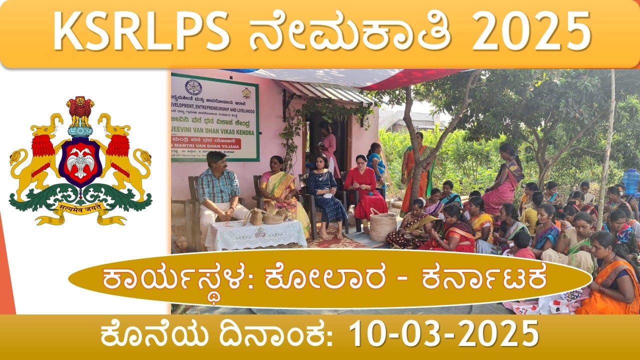 KSRLPS ನೇಮಕಾತಿ 2025: ಕರ್ನಾಟಕ ರಾಜ್ಯ ಗ್ರಾಮೀಣ ಜೀವನೋದ್ಯಮ ಪ್ರೋತ್ಸಾಹನಾ ಸಂಸ್ಥೆ (KSRLPS) 12 ಕ್ಲಸ್ಟರ್ ಸಪರ್ವೈಸರ್, ಬ್ಲಾಕ್ ಮ್ಯಾನೇಜರ್ ಹುದ್ದೆಗಳನ್ನು ಭರ್ತಿಯಾಗಿಸಲು ಅರ್ಜಿ ಆಹ್ವಾನಿಸಿದೆ. 2025