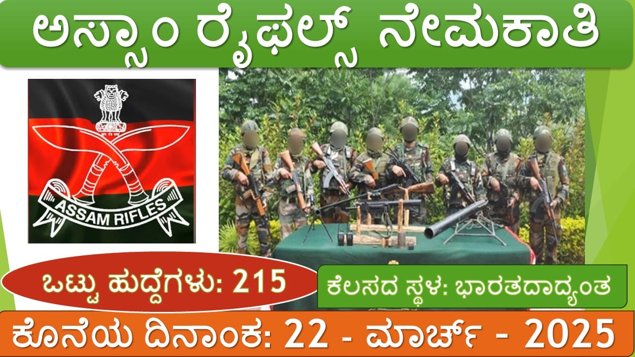 ಅಸ್ಸಾಂ ರೈಫಲ್ಸ್ ನೇಮಕಾತಿ 2025: 215 ತಾಂತ್ರಿಕ ಮತ್ತು ವ್ಯಾಪಾರಿ ಹುದ್ದೆಗಳಿಗಾಗಿ ಅರ್ಜಿ ಸಲ್ಲಿಸಲು ಅವಕಾಶವಿದೆ. ಅಸ್ಸಾಂ ರೈಫಲ್ಸ್ ಫೆಬ್ರವರಿ 2025 ರ ಅಧಿಕೃತ ಅಧಿಸೂಚನೆಯನ್ನು ಪ್ರಕಟಿಸಿದೆ,