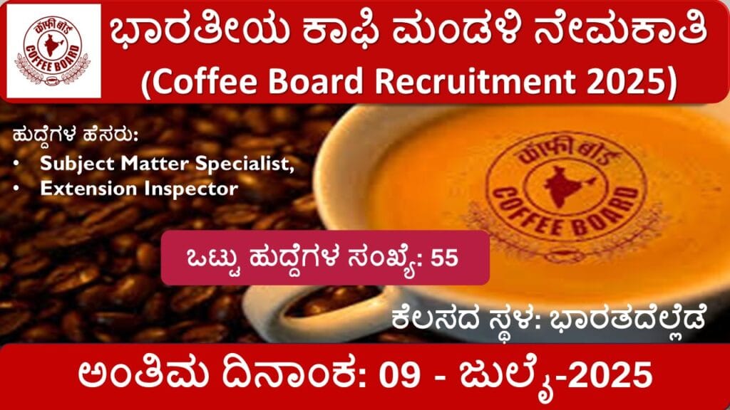 ಇದು ಭಾರತೀಯ ಕಾಫಿ ಮಂಡಳಿ ನೇಮಕಾತಿ 2025 (Coffee Board Recruitment 2025)**ಗೆ ಸಂಬಂಧಪಟ್ಟ ಸಂಪೂರ್ಣ ಮಾಹಿತಿ ಕನ್ನಡದಲ್ಲಿ: ಸಂಸ್ಥೆ ಹೆಸರು: ಭಾರತೀಯ ಕಾಫಿ ಮಂಡಳಿ (Coffee Board of India)ಒಟ್ಟು ಹುದ್ದೆಗಳ ಸಂಖ್ಯೆ: 55ಕೆಲಸದ ಸ್ಥಳ: ಭಾರತದೆಲ್ಲೆಡೆಹುದ್ದೆಗಳ ಹೆಸರು: Subject Matter Specialist, Extension Inspectorವೇತನ ಶ್ರೇಣಿ: ₹29,200/- ರಿಂದ ₹2,08,700/- ಪ್ರತಿಮಾಸಕ್ಕೆಅರ್ಜಿ ಸಲ್ಲಿಕೆ ವಿಧಾನ: ಆನ್ಲೈನ್ಅಂತಿಮ ದಿನಾಂಕ: 09-ಜುಲೈ-2025