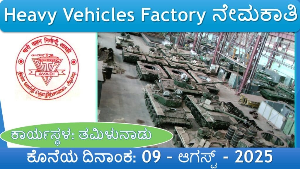HVF Avadi Recruitment 2025: ಚೆನ್ನೈ, ತಮಿಳುನಾಡು ಪ್ರದೇಶದಲ್ಲಿ ಇರುವ ಹೆವಿ ವೆಹಿಕಲ್ಸ್ ಫ್ಯಾಕ್ಟರಿ (HVF), ಅಸಿಸ್ಟೆಂಟ್ ಮತ್ತು ಜೂನಿಯರ್ ಮ್ಯಾನೇಜರ್ ಹುದ್ದೆಗಳಿಗೆ ಅರ್ಹ ಅಭ್ಯರ್ಥಿಗಳಿಂದ ಅರ್ಜಿಗಳನ್ನು ಆಹ್ವಾನಿಸಿದೆ. ಆಸಕ್ತರು ತಮ್ಮ ಅರ್ಜಿಯನ್ನು 09 ಆಗಸ್ಟ್ 2025ರೊಳಗೆ ಕಡ್ಡಾಯವಾಗಿ ಕಳುಹಿಸಬೇಕು.
