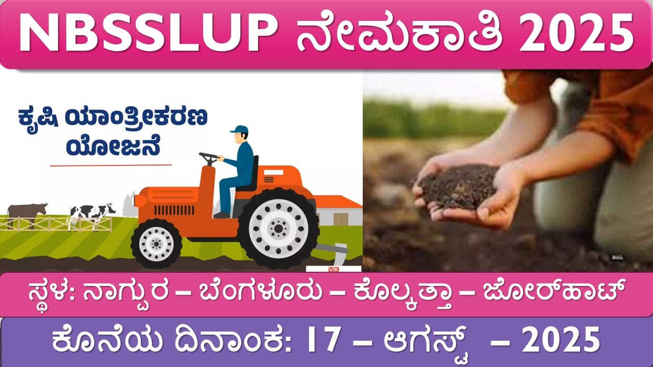 NBSSLUP ನೇಮಕಾತಿ 2025: ತಾಂತ್ರಿಕ ಸಹಾಯಕ ಹಾಗೂ ಹಿರಿಯ ತಾಂತ್ರಿಕ ಅಧಿಕಾರಿ ಹುದ್ದೆಗಳಿಗೆ ಒಟ್ಟು 36 ಹುದ್ದೆಗಳ ಭರ್ತಿಗೆ ಅರ್ಜಿ ಆಹ್ವಾನಿಸಲಾಗಿದೆ. ಮಣ್ಣಿನ ಸಮೀಕ್ಷೆ ಮತ್ತು ಭೂಪಯೋಗ