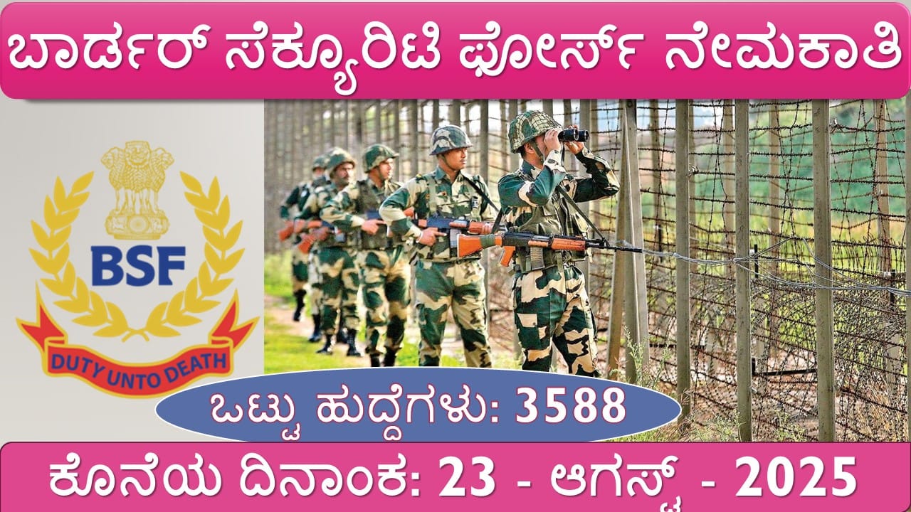 BSF ನೇಮಕಾತಿ 2025: ಬಾರ್ಡರ್ ಸೆಕ್ಯೂರಿಟಿ ಫೋರ್ಸ್ (BSF) ಸಂಸ್ಥೆ 3588 ಕಾನ್ಸ್ಟೇಬಲ್ ಹುದ್ದೆಗಳಿಗೆ ಅರ್ಜಿಗಳನ್ನು ಆಹ್ವಾನಿಸಿದೆ. ಭಾರತದೆಲ್ಲೆಡೆ ಸರ್ಕಾರಿ ಉದ್ಯೋಗ ಹುಡುಕುತ್ತಿರುವ ಅರ್ಹ ಅಭ್ಯರ್ಥಿಗಳು ಈ