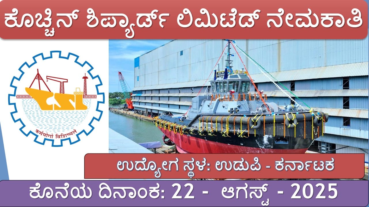 ಕೊಚ್ಚಿನ್ ಶಿಪ್ಯಾರ್ಡ್ ಲಿಮಿಟೆಡ್ ನೇಮಕಾತಿ 2025: ಕೊಚ್ಚಿನ್ ಶಿಪ್ಯಾರ್ಡ್ ಲಿಮಿಟೆಡ್ 35 ಶಿಪ್ ಡ್ರಾಫ್ಟ್ಸ್ಮನ್ ಟ್ರೈನೀ ಹುದ್ದೆಗಳನ್ನು ಭರ್ತಿ ಮಾಡಲು ಅರ್ಹ ಮತ್ತು ಆಸಕ್ತ ಅಭ್ಯರ್ಥಿಗಳಿಂದ ಅರ್ಜಿಗಳನ್ನು