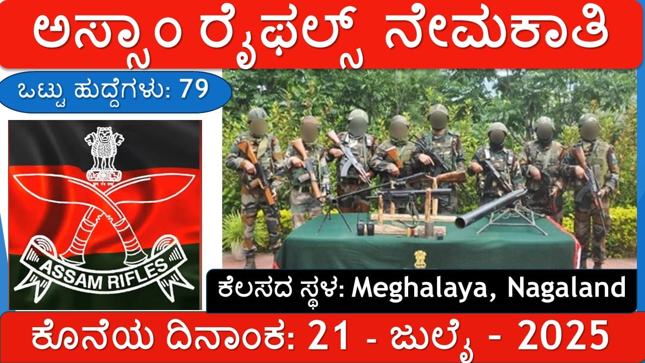 ಅಸ್ಸಾಂ ರೈಫಲ್ಸ್ ನೇಮಕಾತಿ 2025: ಅಸ್ಸಾಂ ರೈಫಲ್ಸ್ ಸಂಸ್ಥೆಯು 79 ರೈಫಲ್ಮ್ಯಾನ್ ಮತ್ತು ವಾರಂಟ್ ಆಫೀಸರ್ ಹುದ್ದೆಗಳಿಗೆ ಅರ್ಹ ಮತ್ತು ಆಸಕ್ತ ಅಭ್ಯರ್ಥಿಗಳಿಂದ ಅರ್ಜಿಗಳನ್ನು ಆಹ್ವಾನಿಸಿದೆ. ಈ