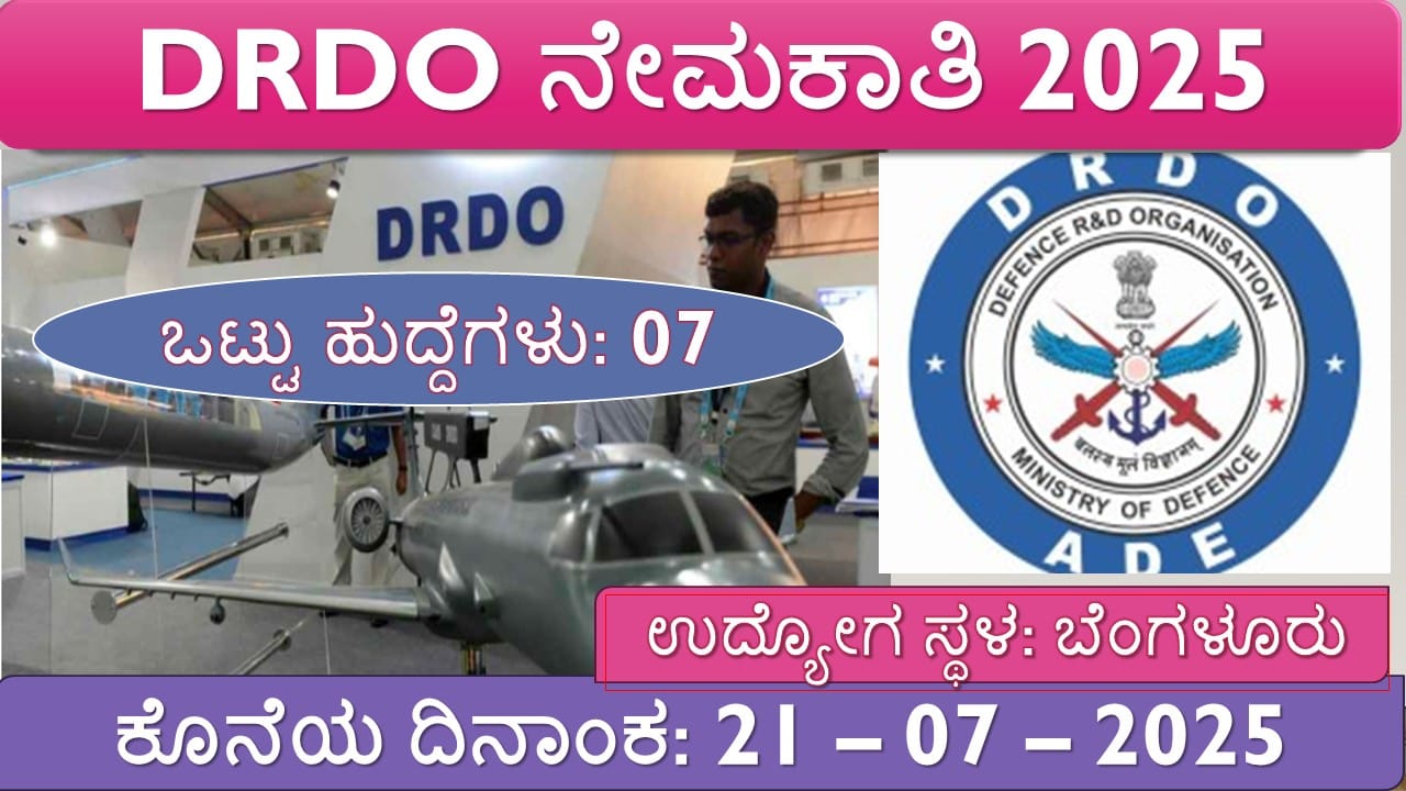 DRDO ನೇಮಕಾತಿ 2025: ಡಿಫೆನ್ಸ್ ರಿಸರ್ಚ್ ಅಂಡ್ ಡೆವಲಪ್ಮೆಂಟ್ ಆರ್ಗನೈಜೆಷನ್ (DRDO) ಸಂಸ್ಥೆಯು 07 ಸಲಹೆಗಾರ (Consultant) ಹುದ್ದೆಗಳನ್ನು ಭರ್ತಿ ಮಾಡಲು ಅರ್ಹ ಹಾಗೂ ಆಸಕ್ತ ಅಭ್ಯರ್ಥಿಗಳಿಂದ