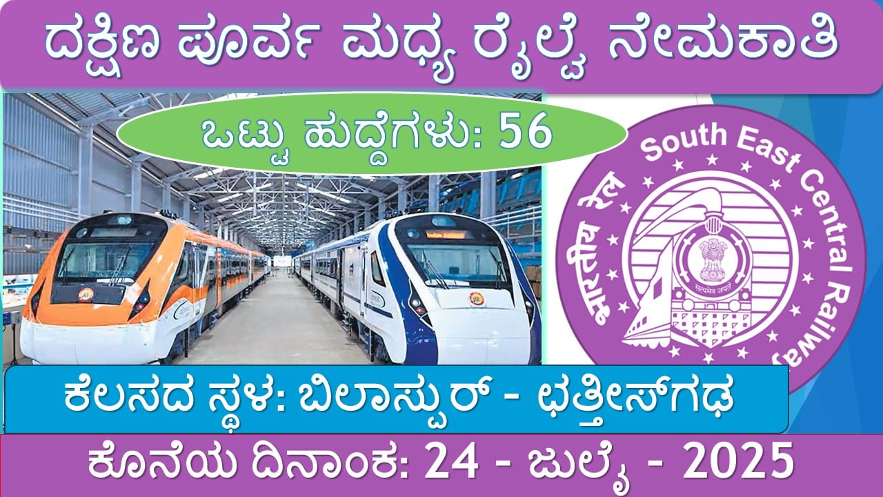 South East Central Railway Recruitment 2025: ಬಿಲಾಸ್ಪುರ್ – ಛತ್ತೀಸ್ಗಢದಲ್ಲಿನ ದಕ್ಷಿಣ ಪೂರ್ವ ಮಧ್ಯ ರೈಲು ಇಲಾಖೆ 56 ಅಸಿಸ್ಟೆಂಟ್ ಹಾಗೂ ಟೆಕ್ನಿಷಿಯನ್ ಹುದ್ದೆಗಳಿಗೆ ಅರ್ಜಿ