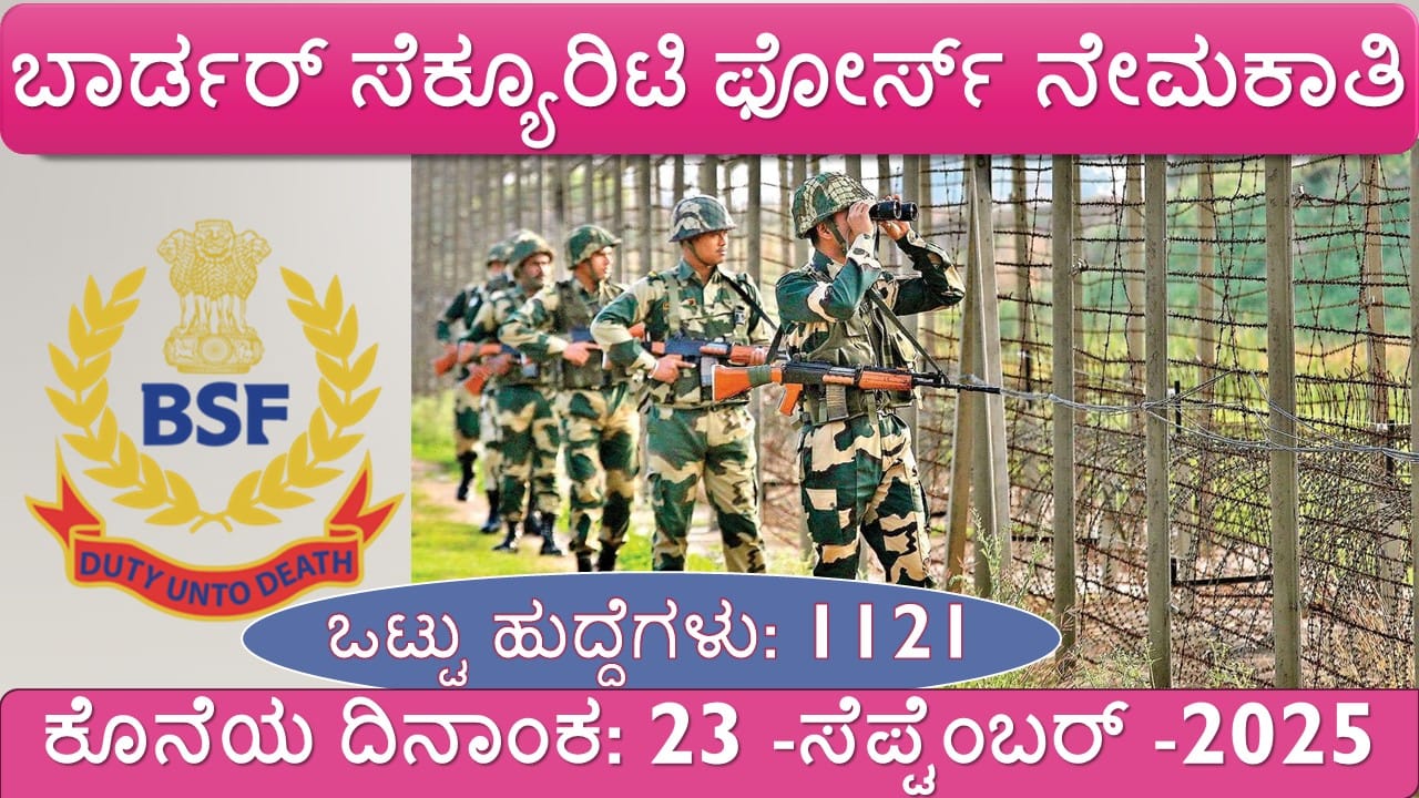 BSF ನೇಮಕಾತಿ 2025:ಒಟ್ಟು 1121 ಹೆಡ್ ಕಾನ್ಸ್ಟೇಬಲ್ ಹುದ್ದೆಗಳಿಗಾಗಿ ಅರ್ಜಿಗಳನ್ನು ಆಹ್ವಾನಿಸಲಾಗಿದೆ. BSF ಅಧಿಕೃತ ಪ್ರಕಟಣೆ (ಆಗಸ್ಟ್ 2025) ಮೂಲಕ ಅರ್ಹ ಮತ್ತು ಆಸಕ್ತ ಅಭ್ಯರ್ಥಿಗಳಿಂದ ಅರ್ಜಿ