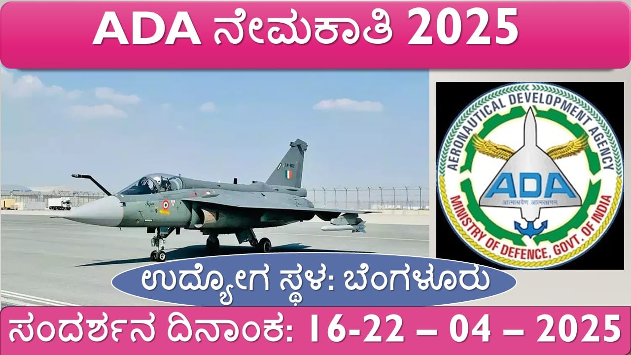 ADA Recruitment 2025:ಏರೋನಾಟಿಕಲ್ ಡೆವಲಪ್ಮೆಂಟ್ ಏಜೆನ್ಸಿ (ADA) 04 ಪ್ರಾಜೆಕ್ಟ್ ಅಸಿಸ್ಟೆಂಟ್ ಹುದ್ದೆಗಳ ಭರ್ತಿಗಾಗಿ ಅರ್ಹ ಹಾಗೂ ಆಸಕ್ತ ಅಭ್ಯರ್ಥಿಗಳಿಂದ ಅರ್ಜಿಗಳನ್ನು ಆಹ್ವಾನಿಸಿದೆ. ಬೆಂಗಳೂರು – ಕರ್ನಾಟಕ