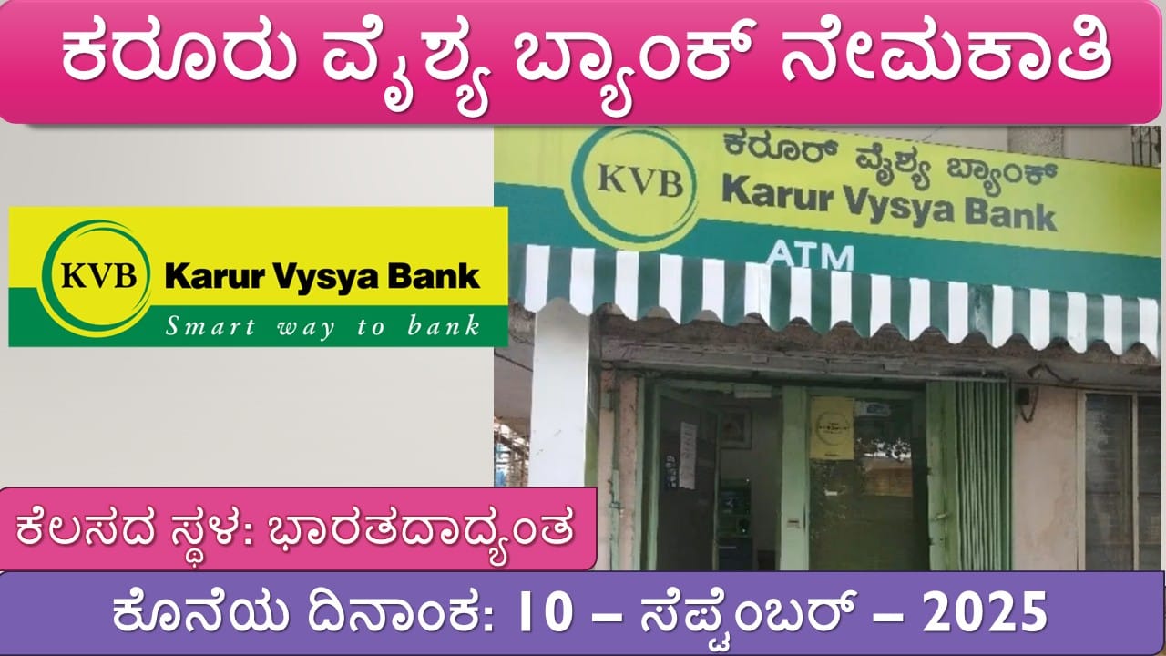 KVB ನೇಮಕಾತಿ 2025: 35 ಕ್ರೆಡಿಟ್ ಮ್ಯಾನೇಜರ್ ಹುದ್ದೆಗಳಿಗಾಗಿ ಅರ್ಜಿ ಆಹ್ವಾನಿಸಲಾಗಿದೆ. ಕರೂರು ವೈಶ್ಯ ಬ್ಯಾಂಕ್ ಅಧಿಕೃತ ಪ್ರಕಟಣೆ ಸೆಪ್ಟೆಂಬರ್ 2025ನಲ್ಲಿ ಹೊರಡಿಸಿದ್ದು, ಆಸಕ್ತ ಹಾಗೂ ಅರ್ಹ