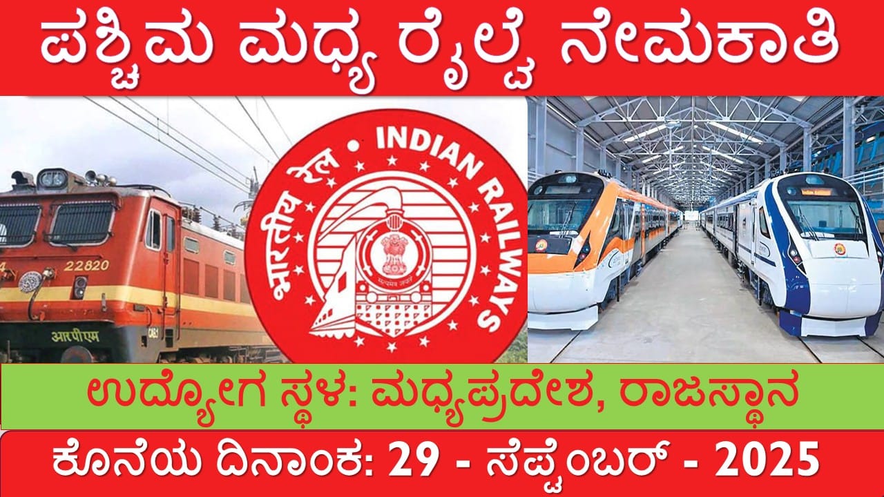 🚆 ಪಶ್ಚಿಮ ಮಧ್ಯ ರೈಲ್ವೆ (West Central Railway) ನೇಮಕಾತಿ 2025 ಒಟ್ಟು ಹುದ್ದೆಗಳು: 2865ಹುದ್ದೆಯ ಹೆಸರು: Apprenticesಕೆಲಸದ ಸ್ಥಳಗಳು: ಜಬಲ್ಪುರ್, ಭೋಪಾಲ್ – ಮಧ್ಯಪ್ರದೇಶ, ಕೋಟಾ